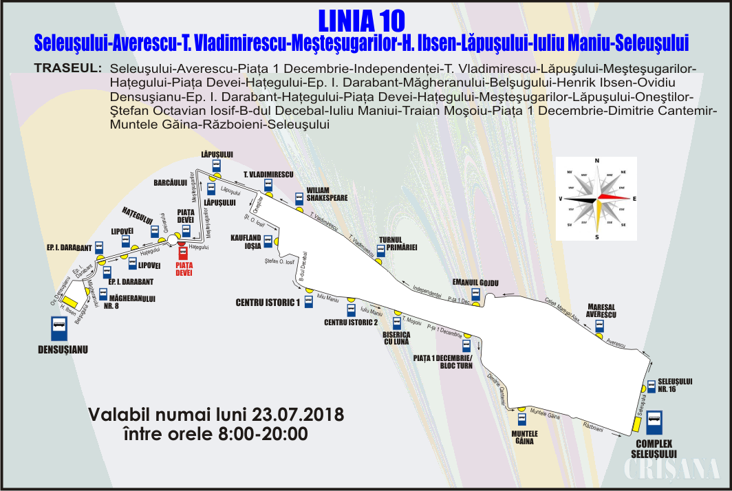 Circulaţia auto în zona giraţiei nou create din interseţia străzilor Barcăului-Greierului-Zarandului va fi închisă luni, 23 iulie, între orele 8.00-20.00. Din această cauză, traseul liniei 10 de autobuz va fi deviat, pe ambele sensuri de circulatie, pe str. Hategului, astfel: spre Henrik Ibsen - traseu nemodificat până la Meşteşugarilor-Haţegului-Piaţa Devei-Haţegului-traseu nemodificat până la staţia cap linie Densusianu; spre Velenţa - traseu nemodificat până la Piaţa Devei-Haţegului-Meşteşugarilor-Lăpuşului-traseu nemodificat până la staţia cap linie Complex Seleuşului. Staţiile de autobuz Greierului şi Barcăului nu vor fi operaţionale. La deplasarea spre Velenţa, dupa ce vor trece de Piaţa Devei, autobuzele liniei 10 vor opri pentru îmbarcarea/debarcarea călătorilor la intrarea pe str. Haţegului.