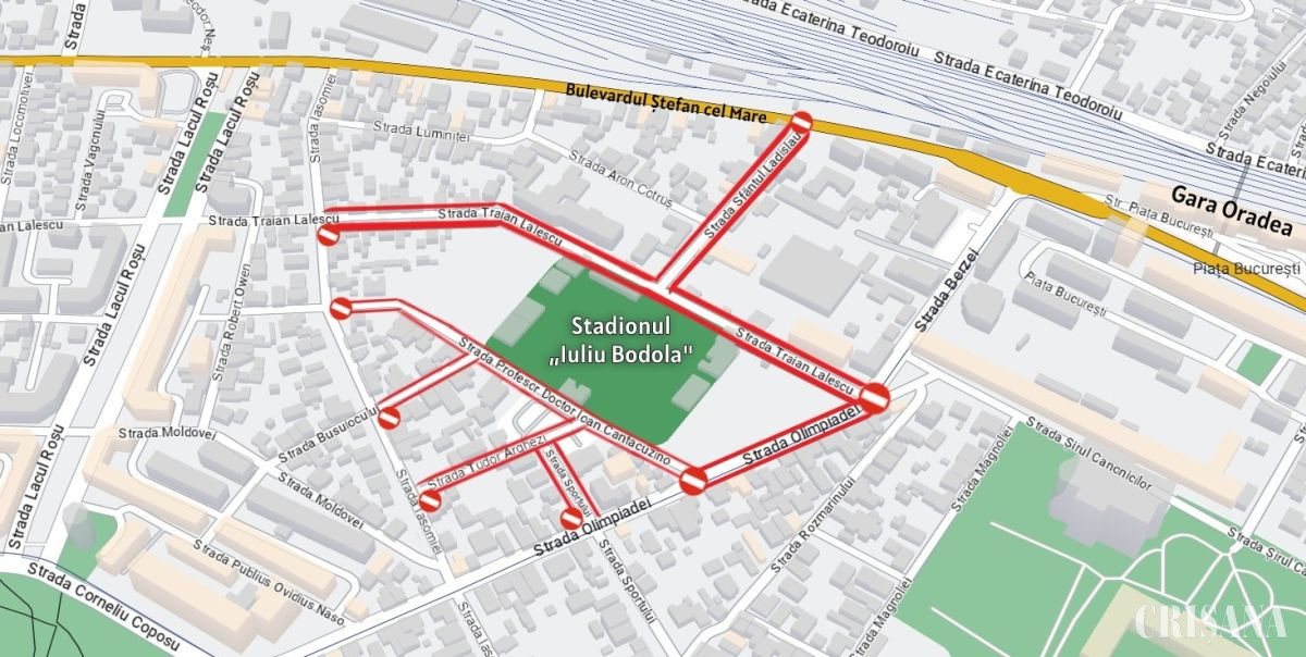 La solicitarea Jandarmeriei Române, în vederea organizării în condiții optime a meciului FC Bihor Oradea - CSC Ghiroda și Giarmata Vii, mâine, 5 iunie, între orele 16.00 – 20.00, se restricționează circulația auto (cu excepția riveranilor și a mijloacelor de transport în comun) pe următoarele străzi: strada Olimpiadei, de la intersecția cu strada Prof. Dr. Ion Cantacuzino până la intersecția cu strada Traian Lalescu; strada Traian Lalescu, de la intersecția cu strada Iasomiei până la intersecția cu strada Olimpiadei; strada Sportului, de la intersecția cu strada Olimpiadei până la intersecția cu strada Tudor Arghezi; strada Tudor Arghezi, de la intersecția cu strada Iasomiei până la intersecția cu strada Prof. Dr. Ion Cantacuzino; strada Busuiocului, de la intersecția cu strada Iasomiei până la intersecția cu strada Prof. Dr. Ion Cantacuzino; strada Prof. Dr. Ion Cantacuzino, de la intersecția cu strada Iasomiei până la intersecția cu strada Olimpiadei; strada Sf. Ladislau, de la intersecția cu strada Piața București până la intersecția cu strada Traian Lalescu.