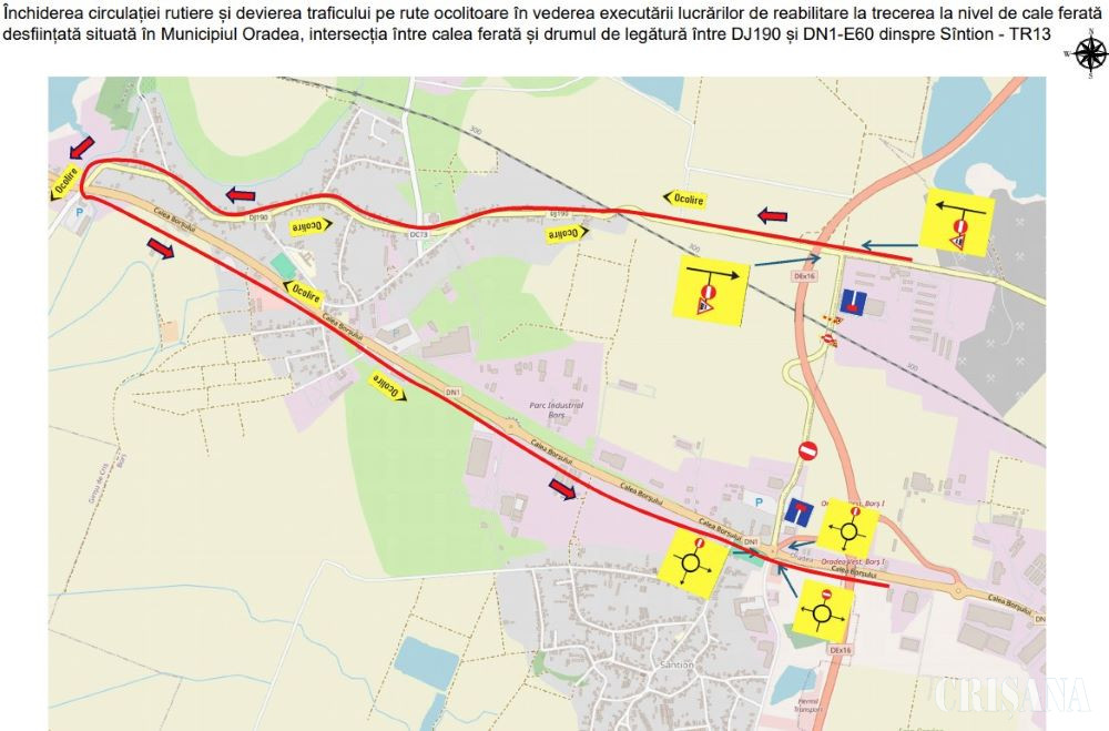 Începând cu 24 iulie, ora 7.00, trecerea la nivel cu calea ferată TR13, situată lângă societatea Comau, între DJ 190 și DN E60, dinspre Sîntion, va fi închisă timp de 36 de ore. Trecerea TR14 va fi la rândul ei închisă începând din 26 iulie, ora 7.00, tot pentru 36 de ore. Lucrările sunt necesare pentru construcția suprastructurii din zonă, realizate de asocierea Webuild Spa - Impresa Pizzarotti&C Spa - Salcef Spa Cluj Napoca - Episcopia Bihor Lot 4. Traficul va fi deviat pe rute ocolitoare.